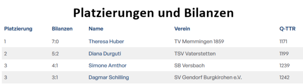 Im Viertelfinale wartete mit Petra Langbauer (1257 TTR-Punkte) eine der stärksten Gegnerinnen des Feldes. Trotz Handverletzung, einem 0:2-Rückstand und spürbaren Schmerzen zeigte Diana außergewöhnlichen Willen und drehte das Match noch zu einem 3:2-Sieg. Damit hatte sie bereits das wichtigste Ziel erreicht: Die Qualifikation für die TT-Finals 2026 — also die Deutschen Meisterschaften der Leistungsklassen — vom 04.–07. Juni 2026 in Erfurt.