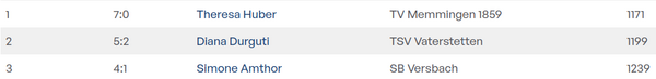 Dort wurde es nicht leichter. Es ging in Sätzen hin und her. Aus Dianas Sicht war das 1:0, 1:1, 1:2, 2:2. Im entscheidenden fünften Satz hat Diana die Nerven behalten und konnte ihn mit 12:10 in der Verlängerungung gewinnen.